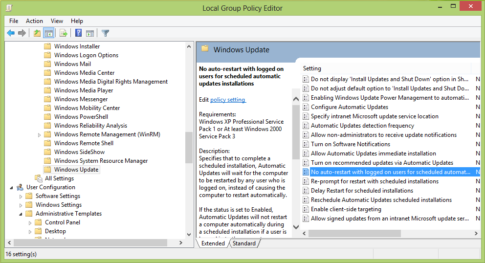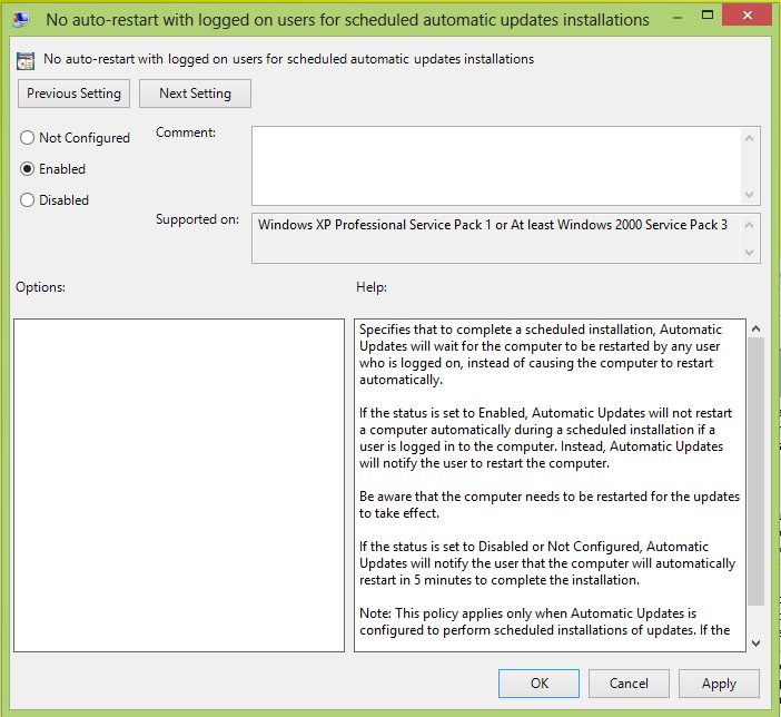 - Right click on “No auto-restart with logged on users for scheduled automatic updates installations”